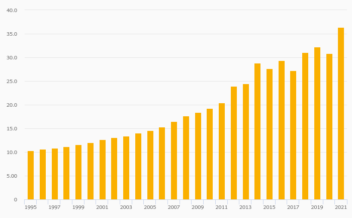 Households' Assets In Dwellings (Local Currency) rose 18.0% to EUR 36.4 bil in Luxembourg in 2021