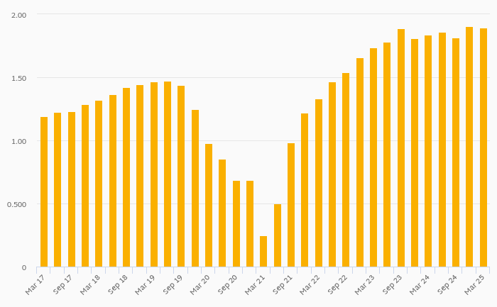 Bank Pre-Tax Return on Assets (Pre-Tax ROA) rose 2.82% yoy to 1.89% in Kuwait in 1Q2025