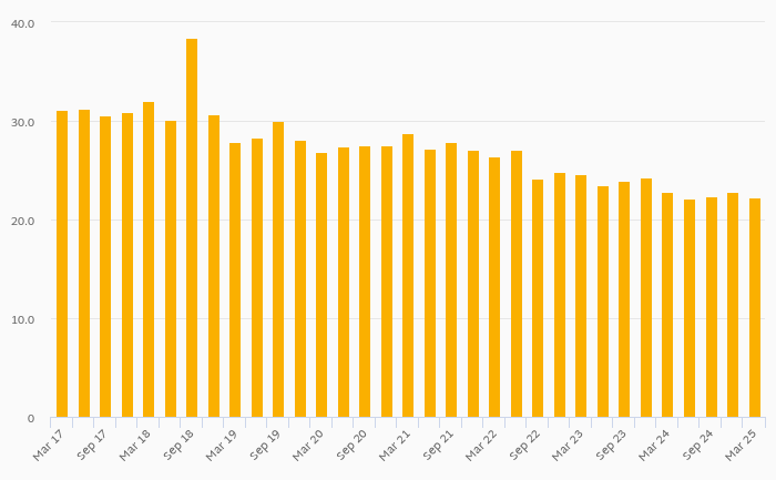 Bank Liquid Assets (As % of Short-Term Liabilities) fell 2.83% yoy to 22.2% in Kuwait in 1Q2025