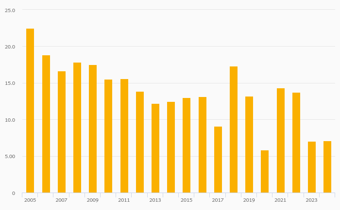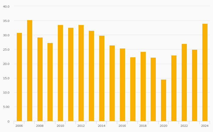Bank Pre-Tax Return on Equity (Pre-Tax ROE) fell 4.91% to 25.2% in Georgia in 2024