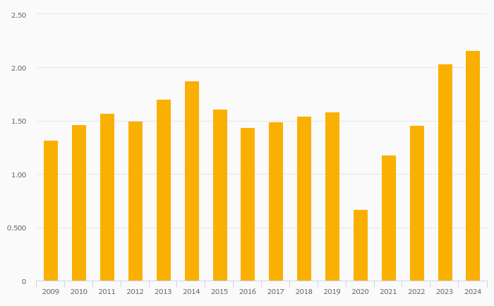 Non-Performing Loans (As % of Total Loans) fell 25.6% to 2.50% in India in 2024