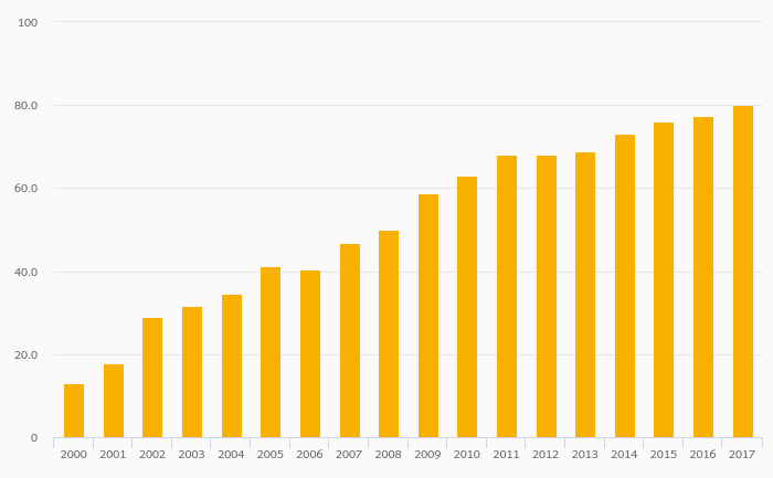 Share of Population Using Internet rose 3.60% to 80.1% in Malta in 2017