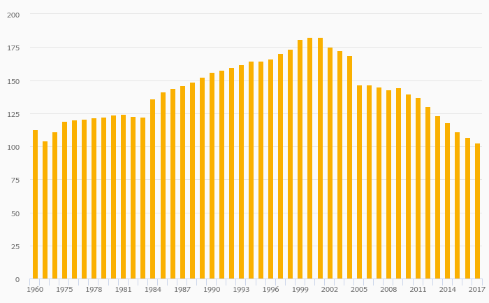 Fixed Lines Per Household fell 3.96% to 103% in Canada in 2017