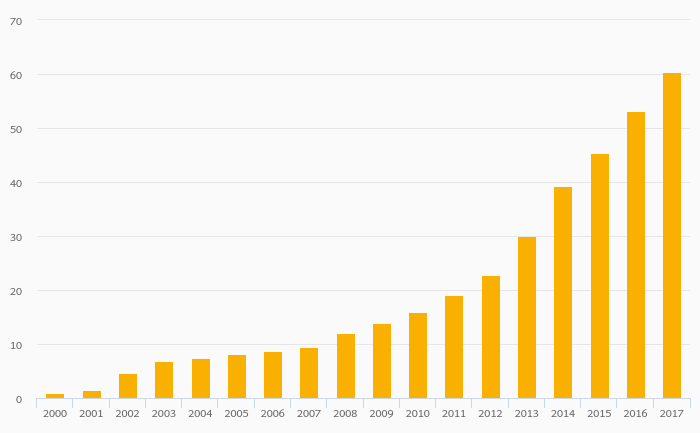 Share of Population Using Internet rose 13.5% to 60.4% in Iran in 2017