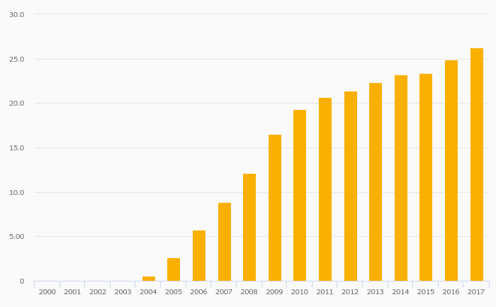 Fixed Broadband Internet Penetration Based on Connections (As % of Population) rose 5.60% to 26.3% in Croatia in 2017