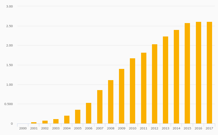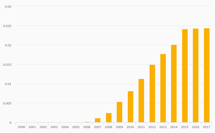 Share of Population Using Internet rose 2.07% to 54.3% in China in 2017