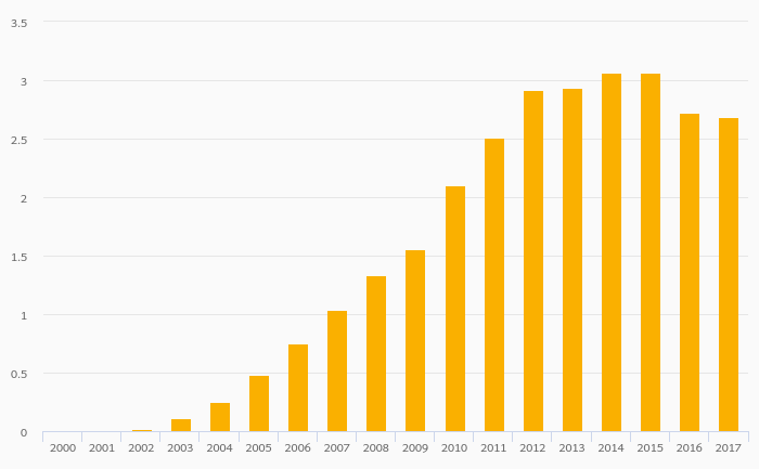 Number of Fixed Broadband Internet Connections fell 1.14% to 2.69 mil in Malaysia in 2017