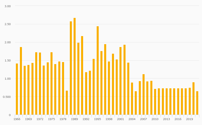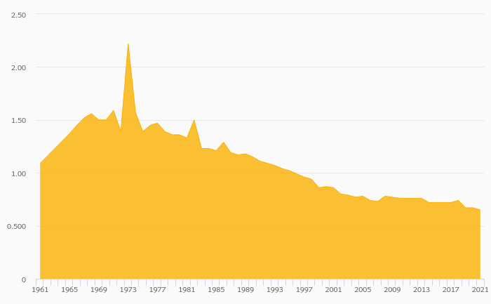Alcoholic Beverage Consumption Per Capita (Distilled) fell 2.99% to 0.650 litres in Guinea Bissau in 2021