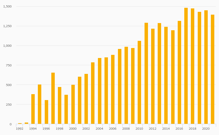 Banana Consumption (Total) fell 3.65% to 1,398 kt in Russia in 2021