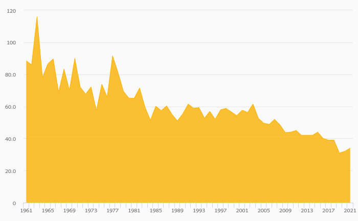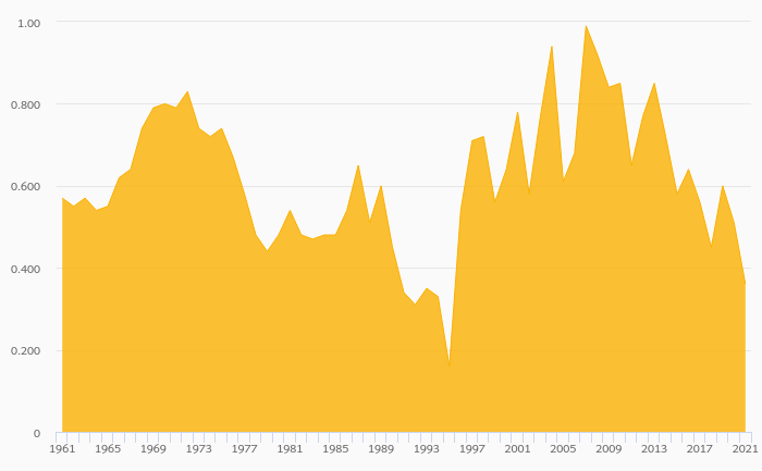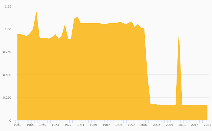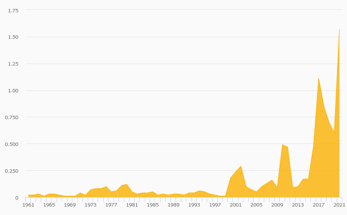 Alcoholic Beverage Consumption Per Capita (Distilled) rose 162% to 1.57 litres in Ghana in 2021