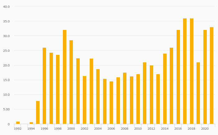 Banana Consumption (Total) rose 3.13% to 33.0 kt in Lithuania in 2021