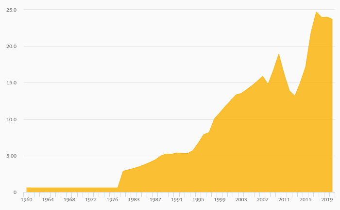 Fixed Line Penetration (As % of Population) fell 1.28% to 23.7% in Libya in 2020