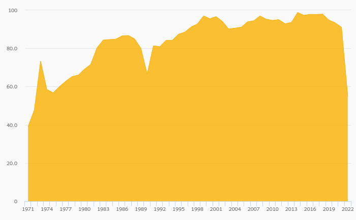 Electricity Production from Oil, Gas & Coal Sources (As % of Total) fell 39.8% to 54.8% in Lebanon in 2022