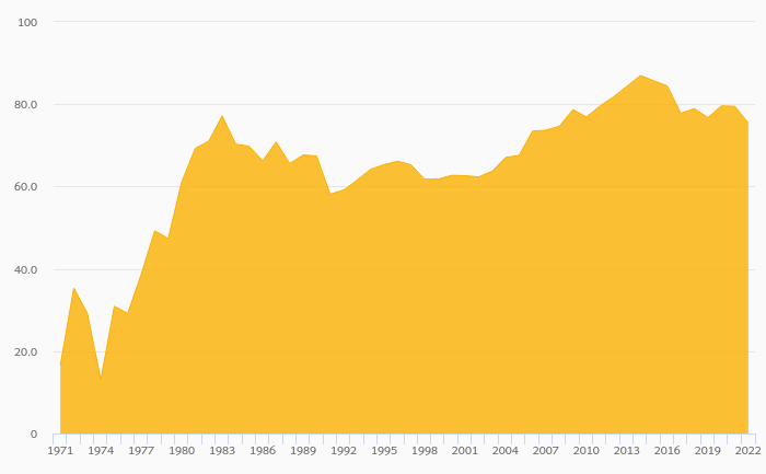 Electricity Production from Oil, Gas & Coal Sources (As % of Total) fell 5.07% to 75.5% in Nigeria in 2022