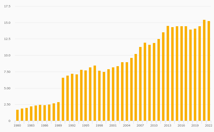 Energy Use (kg of Oil Equivalent) Per USD 1,000 of GDP (Constatnt 2011 PPP) fell 3.70% to 86.2 kg in the USA in 2023