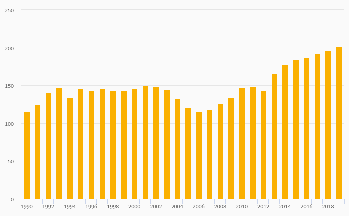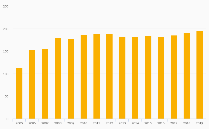Passenger Cars Per 1,000 People rose 2.83% to 196 vehicles in Oman in 2019