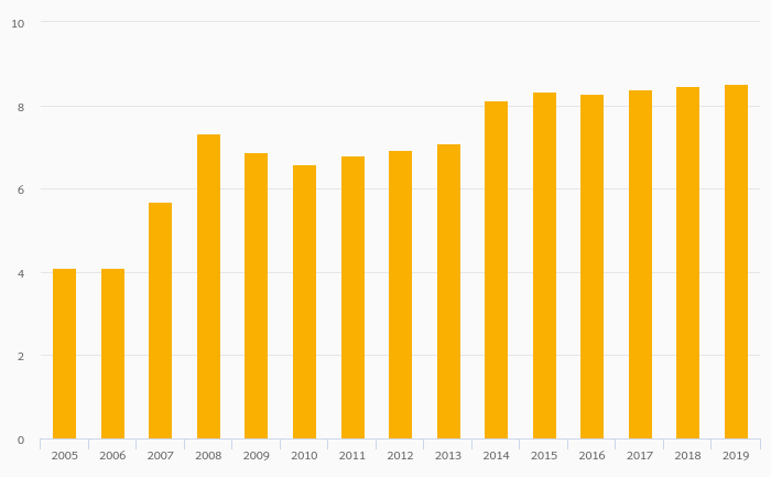 Passenger Cars Per 1,000 People rose 0.701% to 8.51 vehicles in Madagascar in 2019