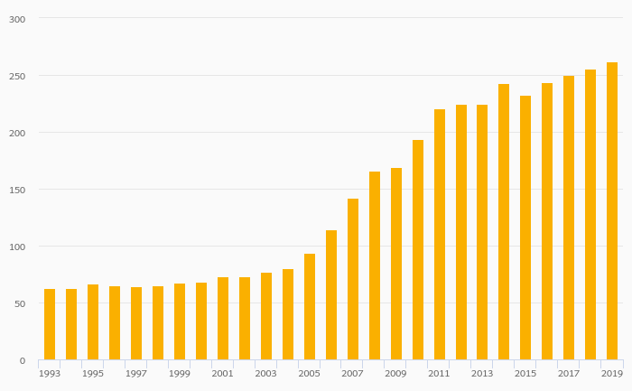 Passenger Cars Per 1,000 People rose 2.38% to 262 vehicles in Kazakhstan in 2019