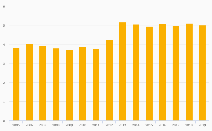 Passenger Cars Per 1,000 People fell 2.00% to 5.00 vehicles in Mauritania in 2019