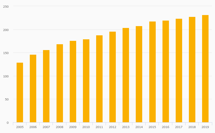 Passenger Cars Per 1,000 People rose 1.70% to 231 vehicles in Mexico in 2019