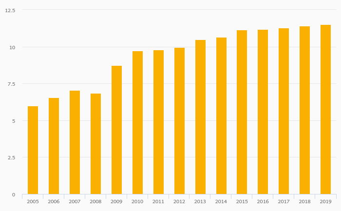 Passenger Cars Per 1,000 People rose 0.902% to 11.5 vehicles in Mozambique in 2019