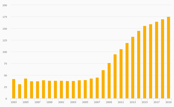 Passenger Cars Per 1,000 People rose 2.95% to 175 vehicles in Kyrgyzstan in 2019