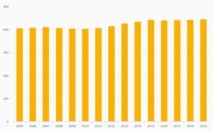 Passenger Cars Per 1,000 People rose 0.473% to 445 vehicles in Kuwait in 2019