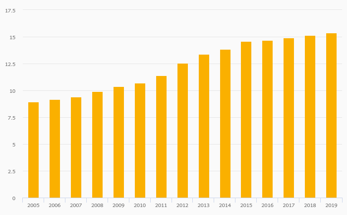 Passenger Cars Per 1,000 People rose 1.55% to 15.4 vehicles in Pakistan in 2019