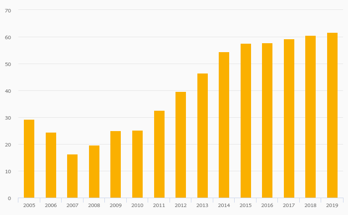 Passenger Cars Per 1,000 People rose 1.96% to 61.7 vehicles in Palestine in 2019