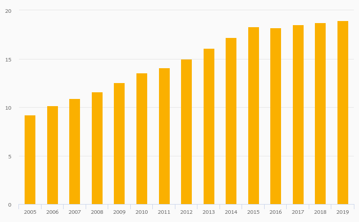 Passenger Cars Per 1,000 People rose 1.19% to 19.0 vehicles in Kenya in 2019
