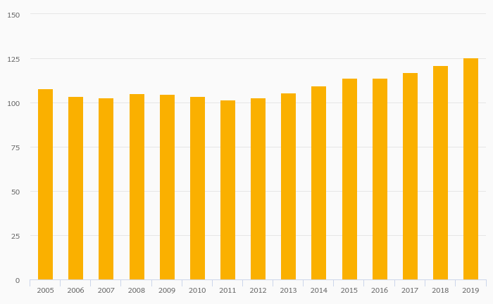 Passenger Cars Per 1,000 People rose 3.43% to 125 vehicles in Lebanon in 2019