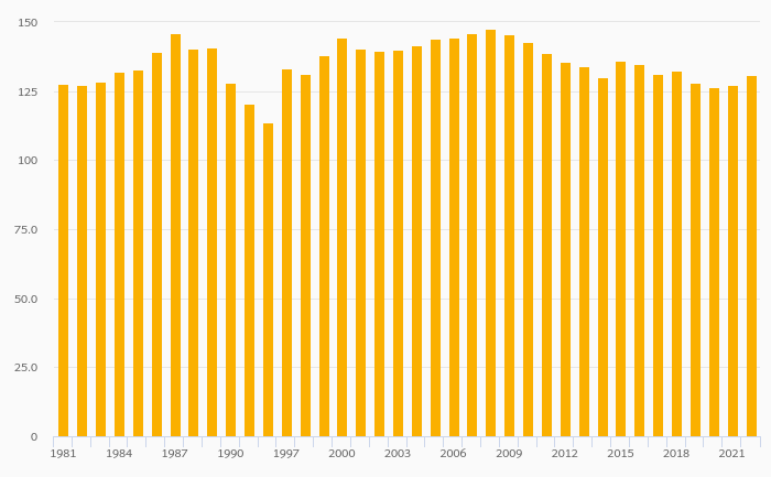 Female to Male Tertiary Enrollment Rate rose 2.72% to 131% in Latvia in 2022