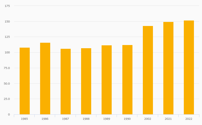 Female to Male Tertiary Enrollment Rate rose 1.79% to 152% in Suriname in 2022
