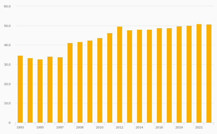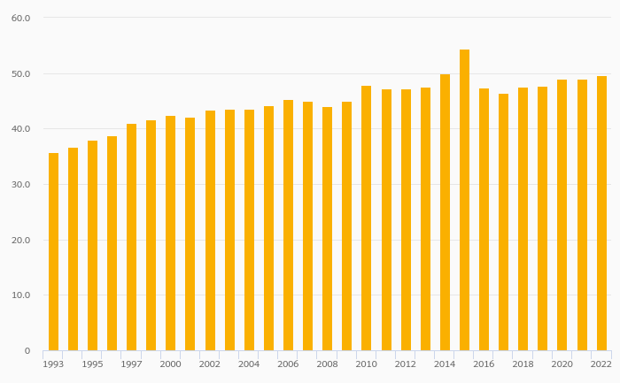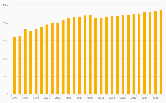 Female Teachers, Tertiary Education (As % of Total) rose 1.05% to 47.3% in Sweden in 2022