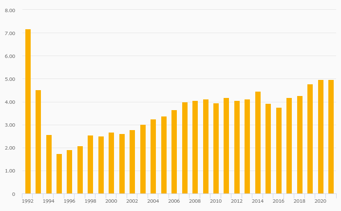 Egg Consumption Per Capita fell 0.201% to 4.96 kg in Kyrgyzstan in 2021
