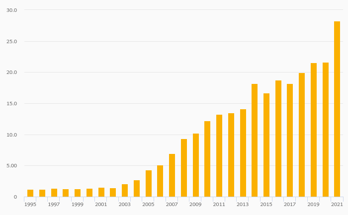 Households' Financial Investments (Local Currency) rose 30.8% to EUR 28.3 bil in Slovakia in 2021
