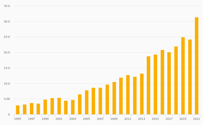 Households' Financial Investments (Local Currency) rose 29.7% to EUR 31.4 bil in Luxembourg in 2021