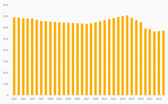 Employment to Population Ratio (15+ Years Old, Female) fell 1.24% to 34.2% in South Africa in 2024
