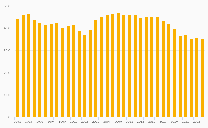 Employment to Population Ratio (15+ Years Old, Female) fell 0.837% to 35.4% in Venezuela in 2024