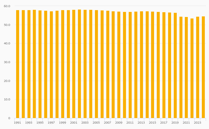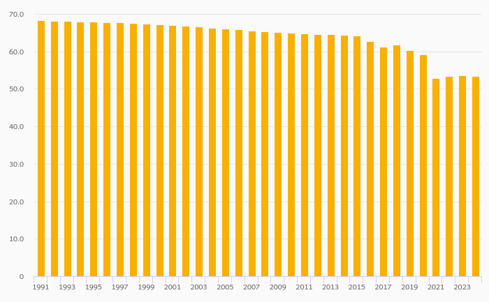 Employment to Population Ratio (15+ Years Old, Total) fell 0.185% to 53.5% in Myanmar in 2024