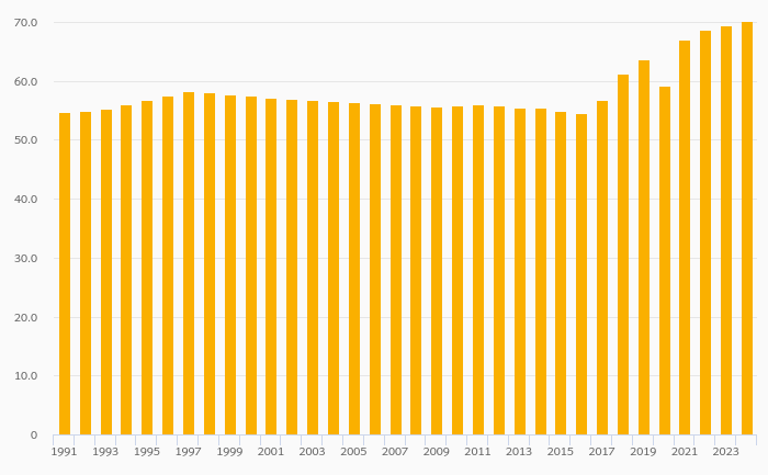 Employment to Population Ratio (15+ Years Old, Female) rose 0.677% to 69.9% in Bolivia in 2024