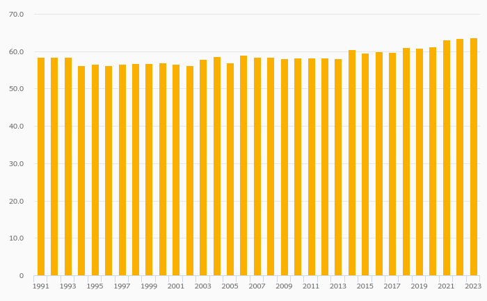 Waged and Salaried Workers, Total (As % of Total Employed) rose 0.296% to 63.7% in El Salvador in 2023