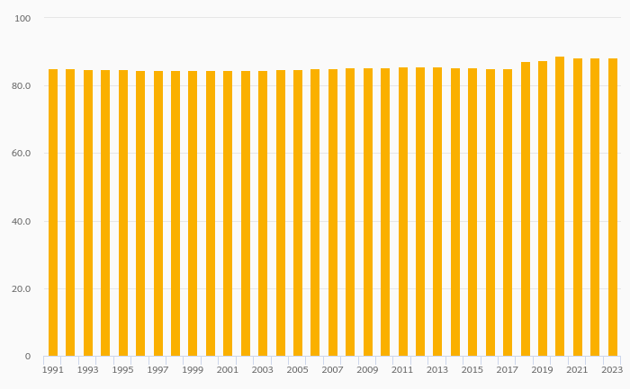 Waged and Salaried Workers, Total (As % of Total Employed) rose 0.015% to 88.3% in Jordan in 2023
