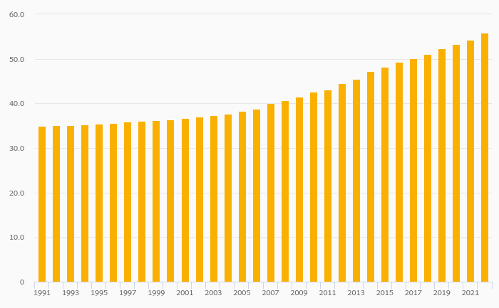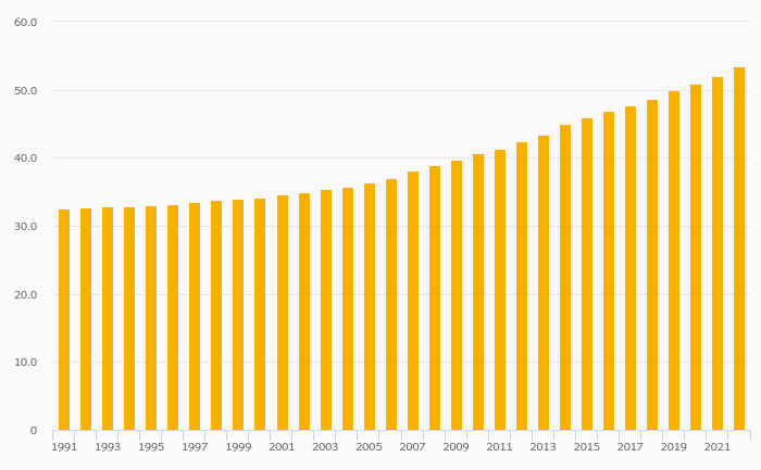 Waged and Salaried Workers, Total (As % of Total Employed) rose 2.83% to 53.5% in Sudan in 2022