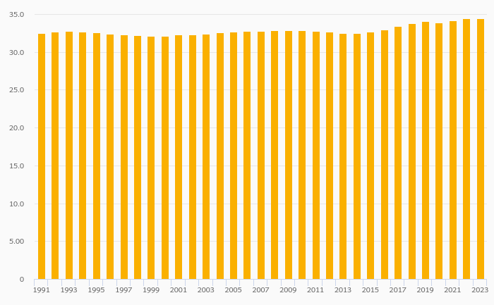 Waged and Salaried Workers, Female (As % of Female Employed) rose 0.033% to 34.5% in Somalia in 2023