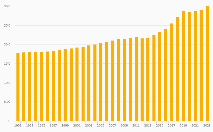 Waged and Salaried Workers, Total (As % of Total Employed) rose 2.98% to 30.8% in Gambia in 2023