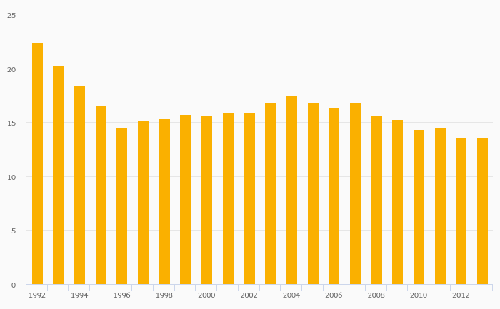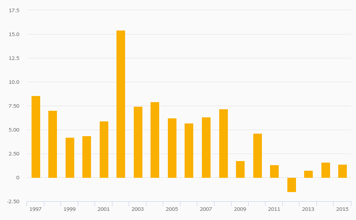 Nominal Gross Wage Growth fell 14.4% to 1.36% in Slovenia in 2015
