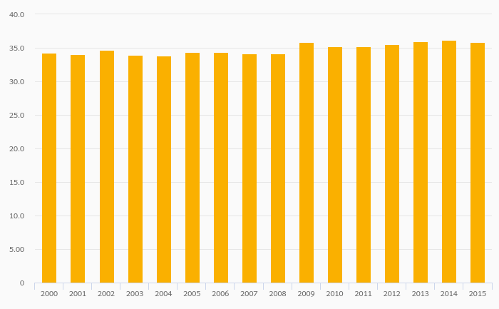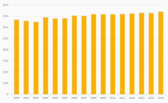 Duration of Working Life (Total) rose 1.65% to 37.0 years in Estonia in 2015
