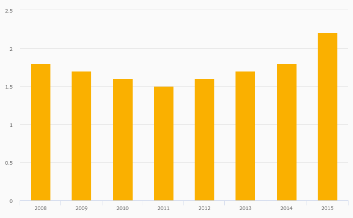 Cultural Employment - From 50 to 59 years (As % of Total Employment) rose 22.2% to 2.20% in Spain in 2015