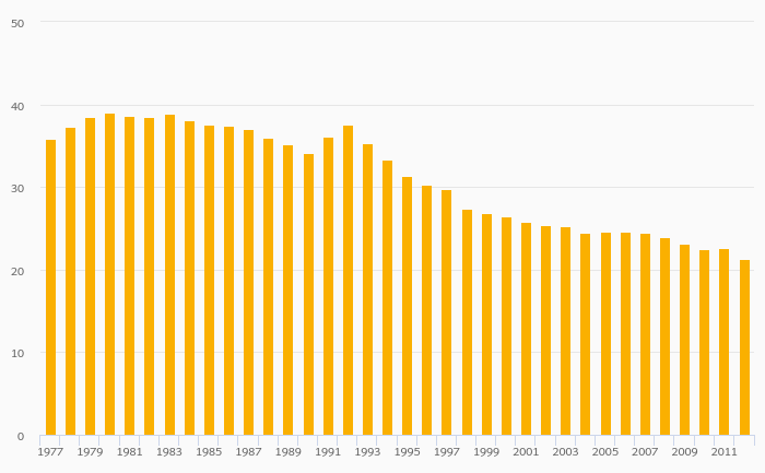 Duration of Working Life (Males) fell 1.10% to 35.8 years in Luxembourg in 2015